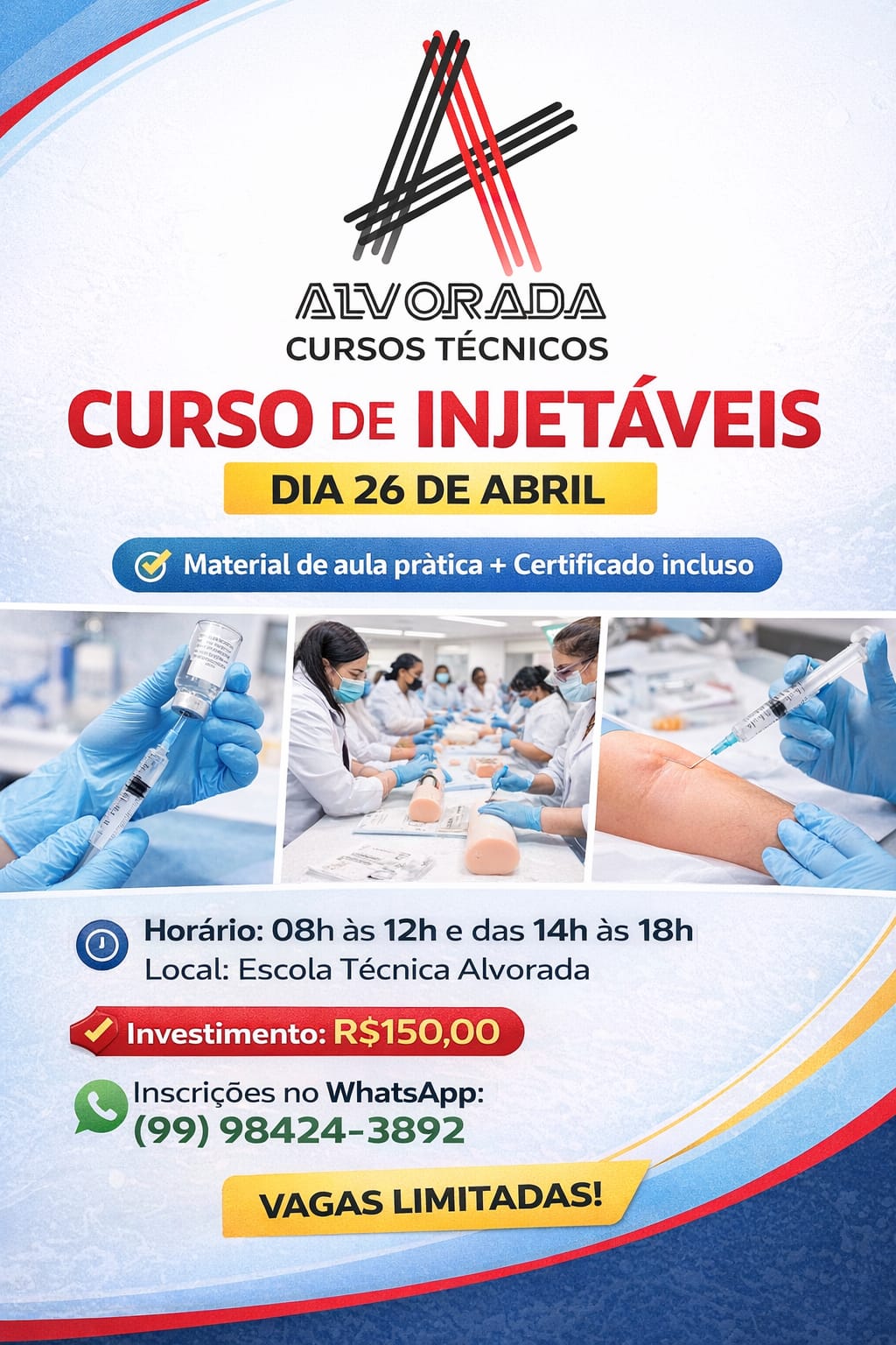 Quer se destacar na área da saúde? Garanta sua vaga no curso rápido de Injetáveis da Escola Técnica Alvorada! Aprenda na prática, com professores experientes, e comece a aplicar seus conhecimentos imediatamente.